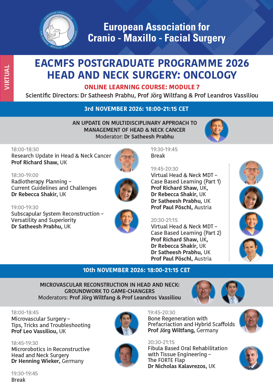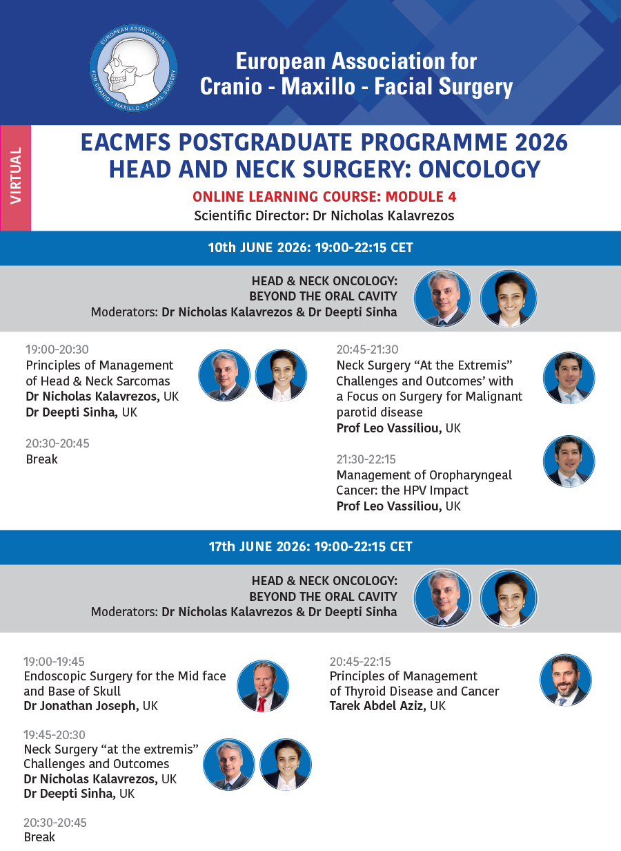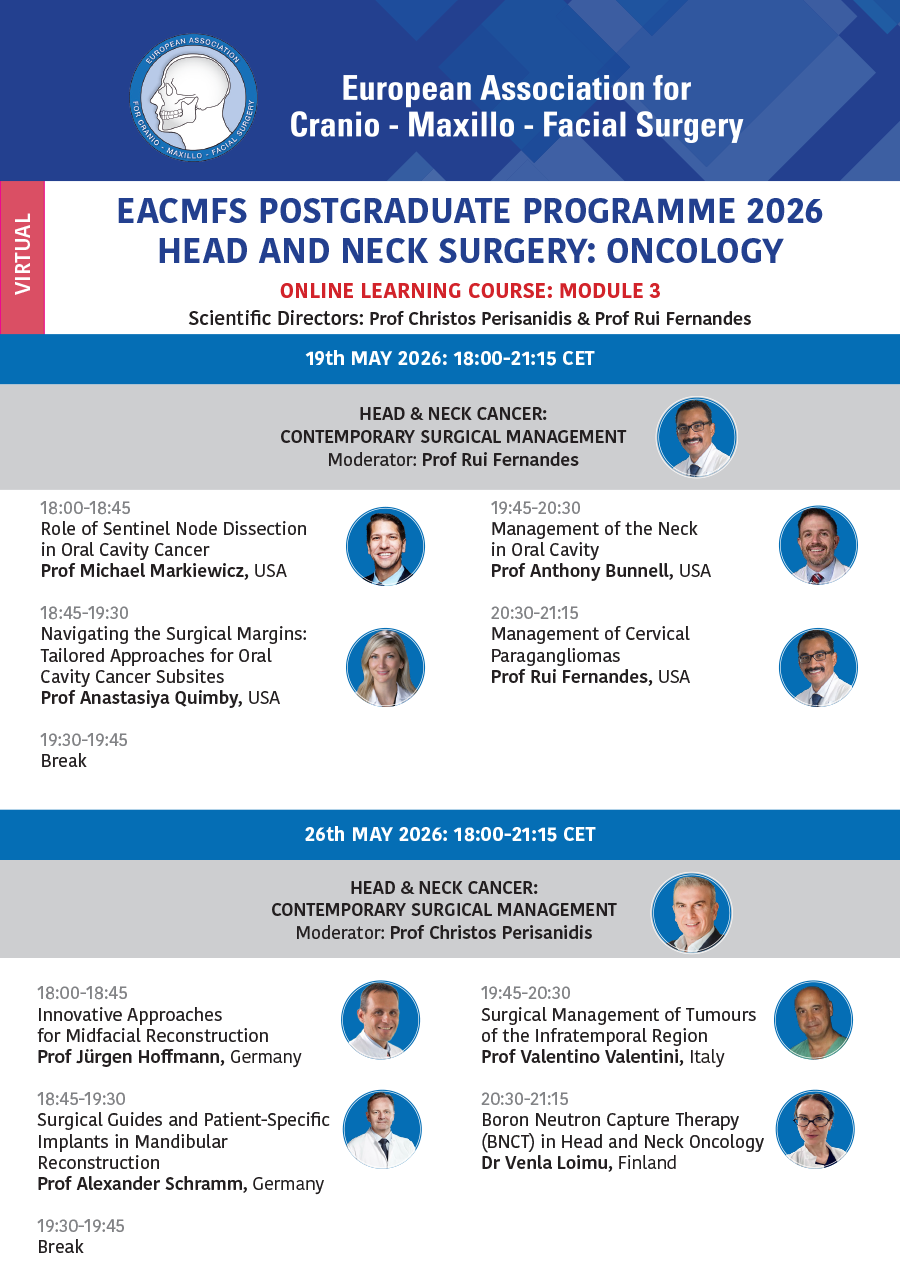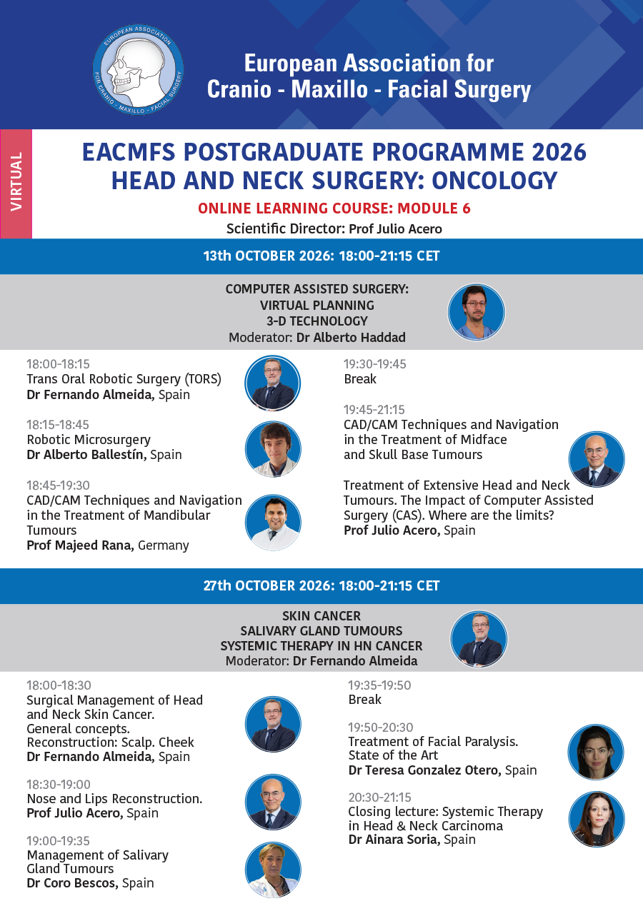 The EACMFS Postgraduate Programme in Head and Neck Surgery: Oncology 2026 represents the 5th edition of this established one-year postgraduate course. Starting in March 2026, it is designed to provide advanced training for Oral and Maxillofacial Surgeons in the diagnosis, treatment planning, and surgical management of head and neck tumours, further developing participants’ expertise to deliver high-quality care.